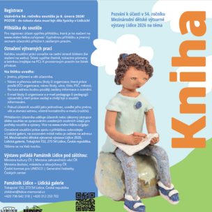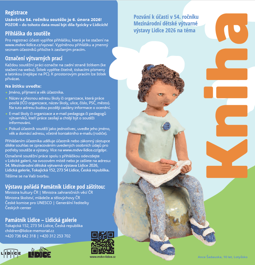 srdečně Vás zveme k účasti v nadcházejícím 54. ročníku Mezinárodní dětské výtvarné výstavy Lidice 2026. Projekt patří k největším a nejstarším svého druhu na světě. Byl založen už v roce 1967 na památku 82 zavražděných dětí z Lidic, stejně jako všech dalších dětí, které zahynuly ve válkách a ozbrojených konfliktech kdekoliv ve světě. O pouhých šest let později se z původně národní výstavy stala výstava mezinárodní, jež si v průběhu let vydobyla světové renomé.
